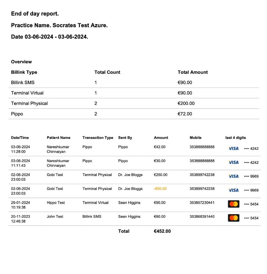 We include an overview of the total transactions and amounts for each transaction type that day. Its important to think of the end of day report really as a cash flow report. By that we mean if a Billink was sent 2 weeks ago but actually paid today then its included in todays report. Similarly if a payment was made for €100 2 weeks ago but you refund €50 today (like in the example above) then the €50 will appear as a negative value in todays report.