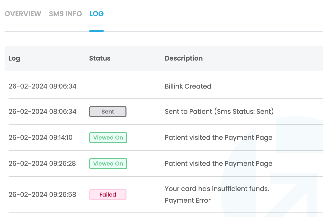 Consider the scenario below – a Billink is sent at 08:26. The patient checks the payment page just over an hour later, and revisits ten minutes after. A subsequent payment attempt fails due to insufficient funds. With our new feature, you’re not just informed of the failure but equipped with the why and when, empowering you to make informed decisions.