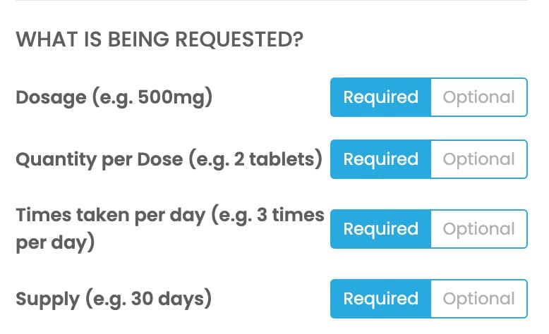 Patients will always be asked to specify the name of the medication that they are requesting however you can now opt to make the additional information now optional. If these are set to ‘required’ then patients cannot proceed in their ordering request without inputting values. If they are set as optional then patients can leave these fields blank.