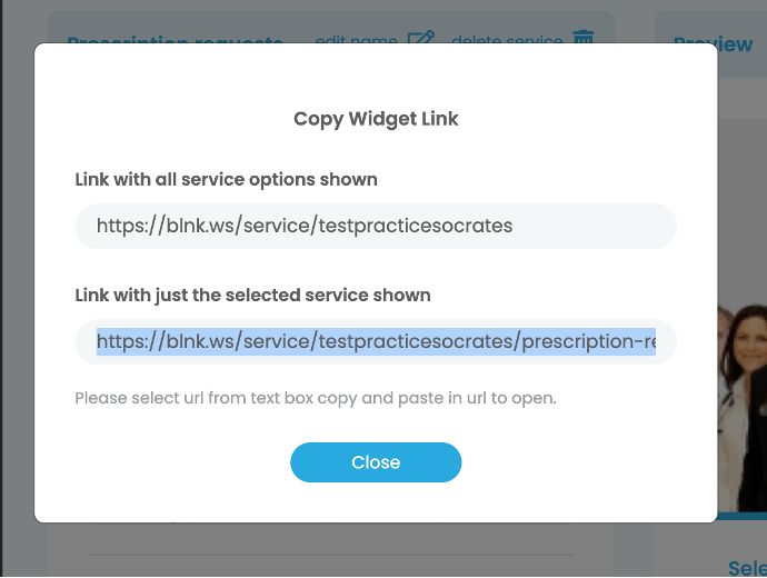 The first option you can copy will give you a link to the general website services screen for your practice. Eg if you have 3 services then this screen will link to a page that has all three listed. If you however want to link to a page with ONLY the prescription services listed and not the other services (as you may want to have this on another part of your website) then you can use the second address box shown on this screen.