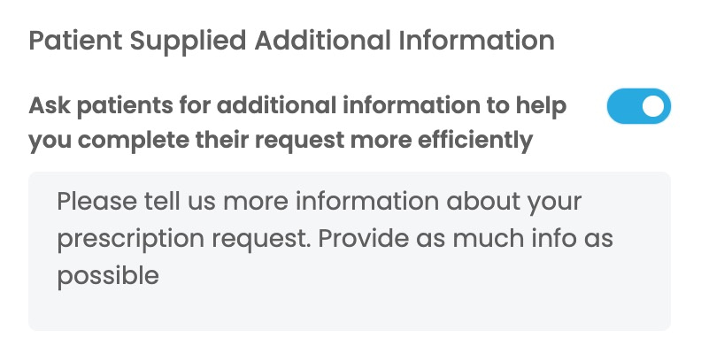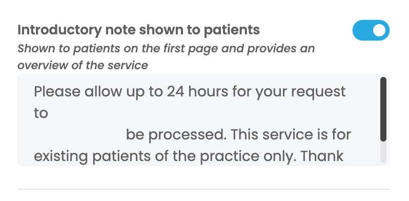 For each service you can chose to have a short note shown to patients before they proceed. For prescriptions this may inform them about how long a script might take to complete or for admin requests it may explain the types of requests that can be facilitated and which can not be. The blue toggle will turn on or hide this introductory note depending on your preference.