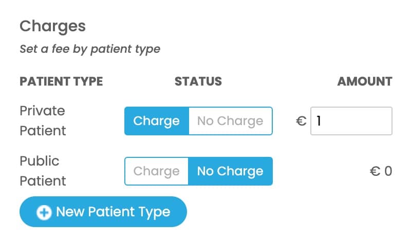 You can set any fee and patient charge type for your service. The default fee is €0. The default to patient types are Private and Public patients. You can add several more patient types to this list and make these specific for this website service. Eg ‘free contraceptive care’ patient type might be set on your prescription type. Or ‘student’ rate might be added as a patient type. You can set the fees then for each of these new patient types.