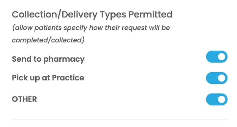 For prescriptions requests you can give patients an option to specify where they would like their script to be sent to. If you prefer to not give this choice you can opt to only have one of these options switched on. If the ‘send to pharmacy’ option is switched on – the patient will be asked to specify the pharmacy name. if the ‘other’ option is switched on – the patient will be asked to type in what this option is.